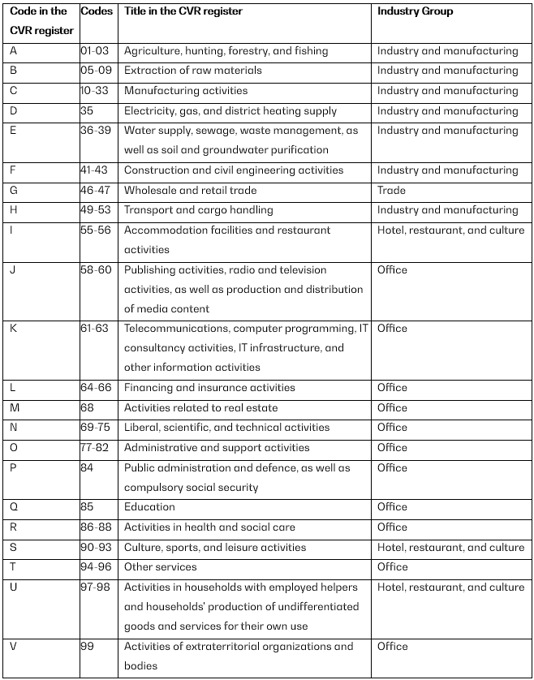 The waste-producing company must find its industry group using the first two digits of the industry code with which it is registered in the CVR number register and the table below. For example, a company with the industry code 10.51.00 (10) is in the industry group "Industry and manufacturing" according to the overview below.