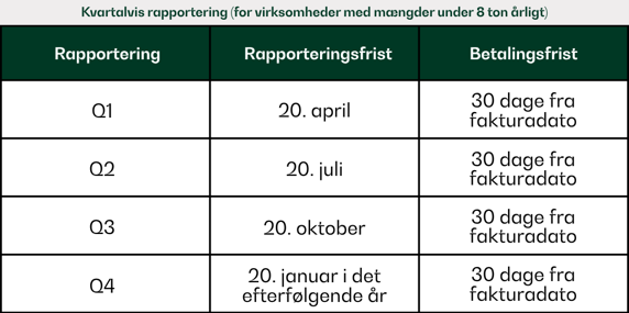 - kvartalsvis (for virksomheder med mængder under 8 ton årligt)