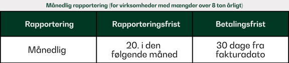 - månedlig (for virksomheder med mængder over 8 ton årligt)